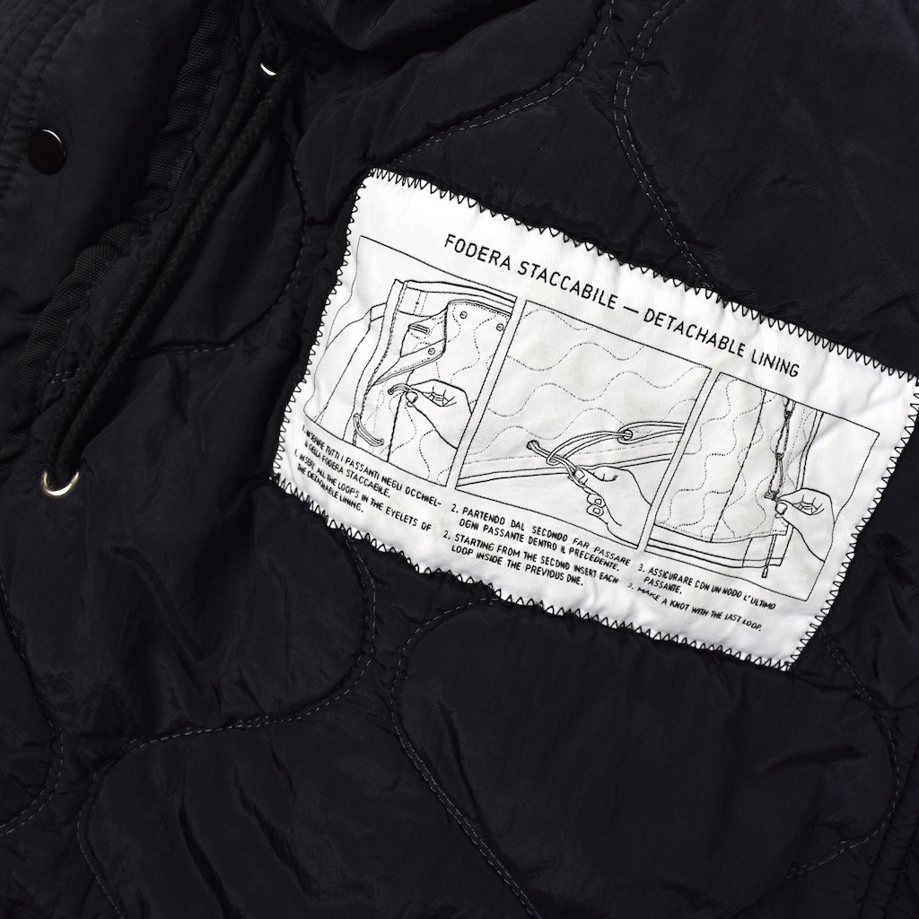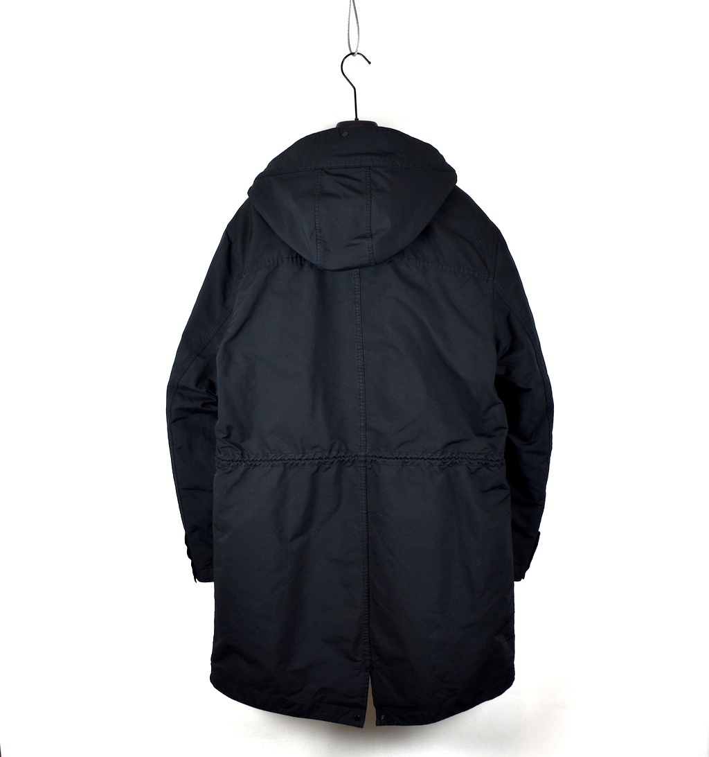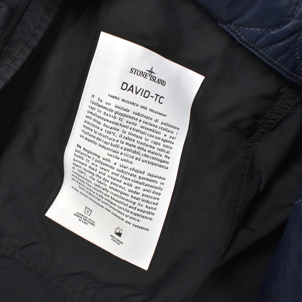 Fishtail parka in David-TC. Starting with an initial star-shaped Japanese polyester/polyamide substrate, garments in DAVID-TC are assembled and then simultaneously dyed and treated with an anti-drop agent. During garment dyeing under pressure at 130°C, the heat radically transforms the structure and feel of the material. The result is beautiful and wearable clothing that combine an industrial feel with a rich and unique tactile experience.