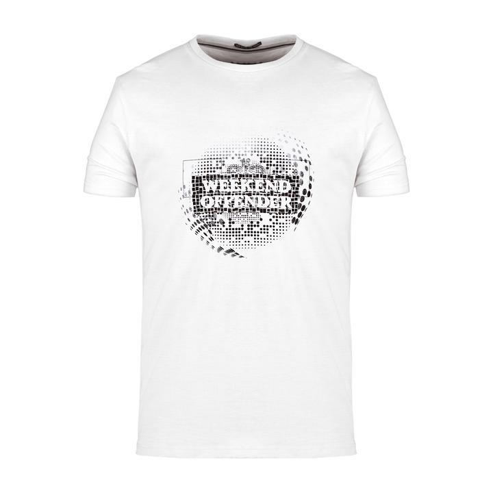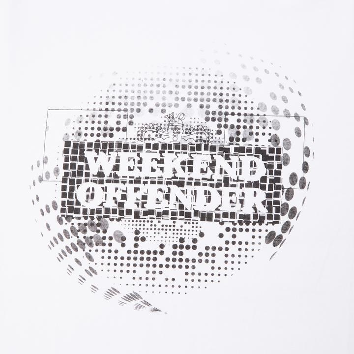 Een grafisch t-shirt van 100% katoen met ronde hals en een abstracte wereldbol print van het iconische Weekend Offender Prison-logo.